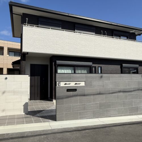 宝塚市にて外構工事をさせていただきました。 300✖️600のタイルをふんだんに使った迫力ある塀によ